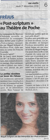 Magali Solignat a travaillé dans les Scènes Nationales des Antilles-Guyane et du Var en tant qu’autrice, comédienne et metteure en scène. Elle est aussi clown. Elle a écrit avec Charlotte Boimare plusieurs pièces primées : Touche-Moi, Le jour où mon père m’a tué et Maïwen 16 ans et demi toutes éditées chez Textes en en Paroles. Ses dernières mises en scène sont L’enfant de Marie-Thérèse Picard, la petite forme de Maïwenn 16 ans et demi à l’Artchipel, Scène Nationale de Guadeloupe et Le jour où mon père m’a tué créée au Liberté, Scène Nationale de Toulon et au Théâtre des Halles à Avignon. La pièce a été diffusé au Lavoir Moderne Parisien, à La Chapelle du Verbe Incarné pendant le festival d’Avignon 2022 ainsi qu’au festival du mois Kréyol la même année. La pièce est soutenue par l’ONDA. A la télévision elle joue dans de nombreuses séries, comme Plus Belle la Vie, La stagiaire, Marianne.